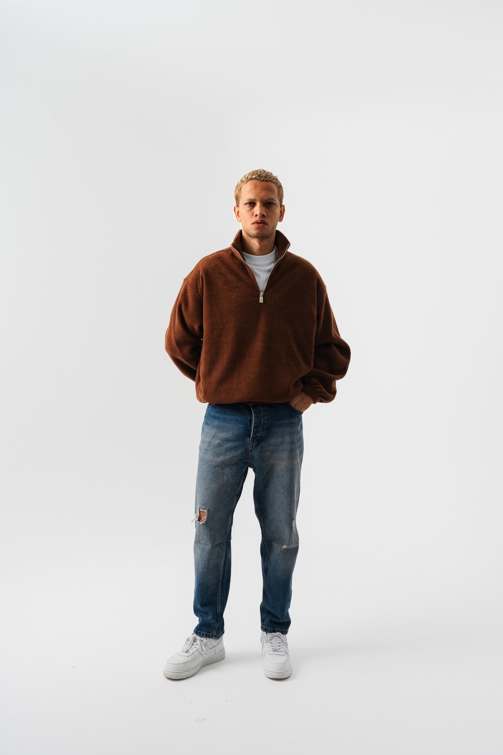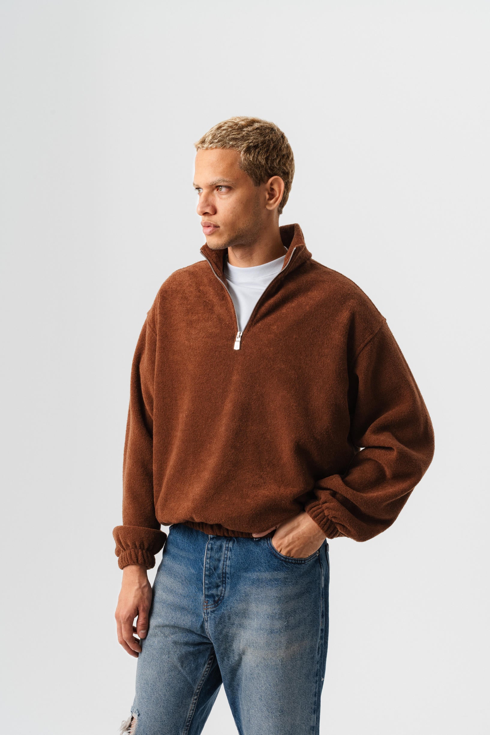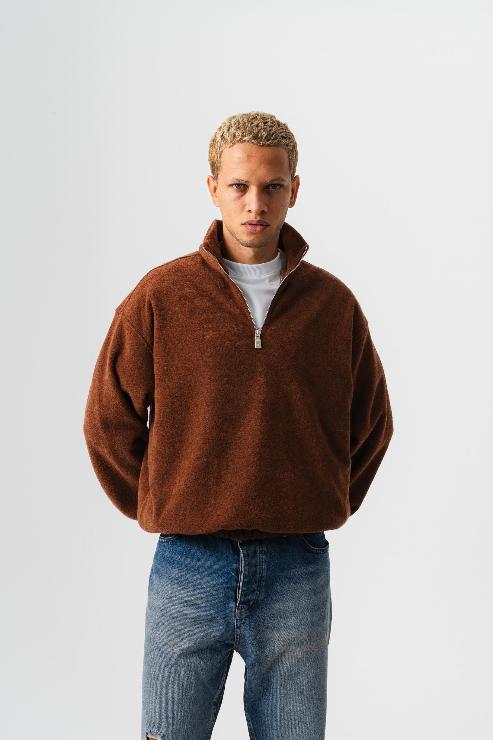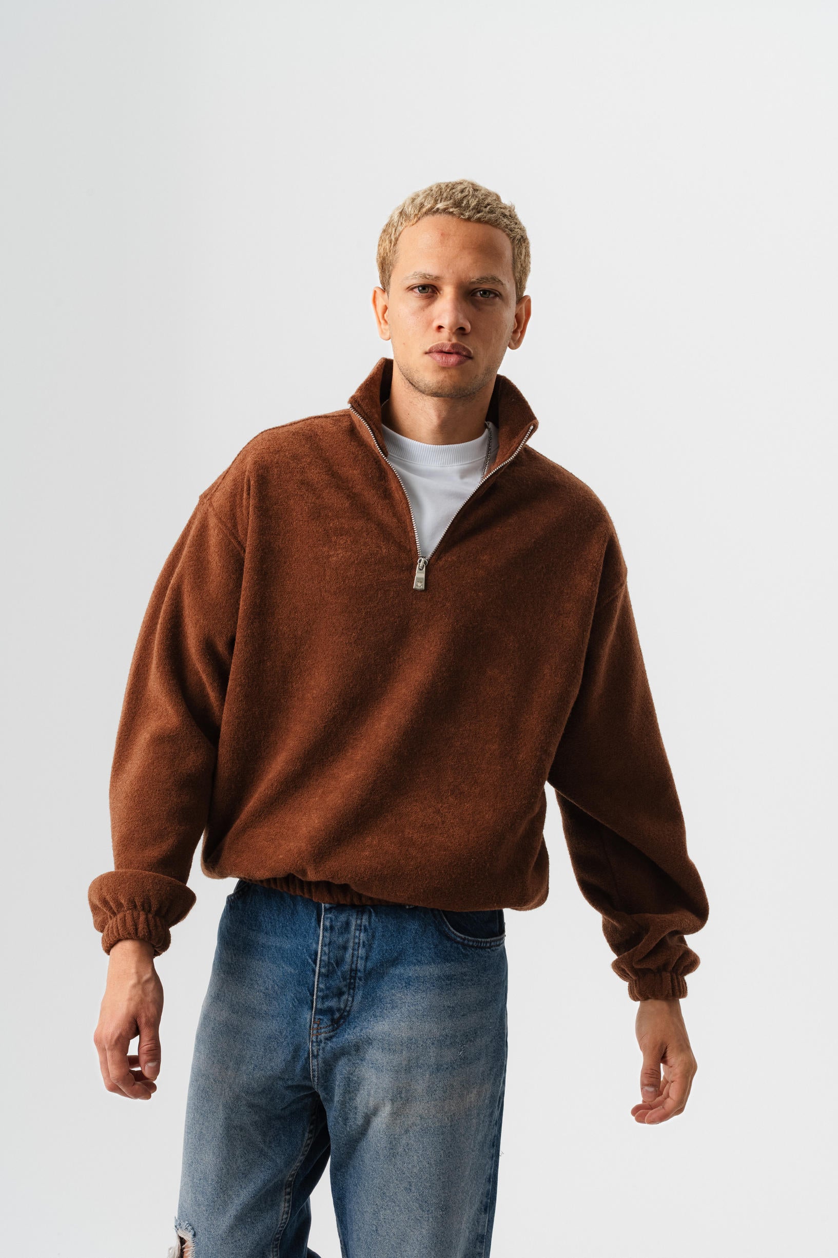Yarım Fermuarlı Basic Oversize Sweatshirt - Kahverengi